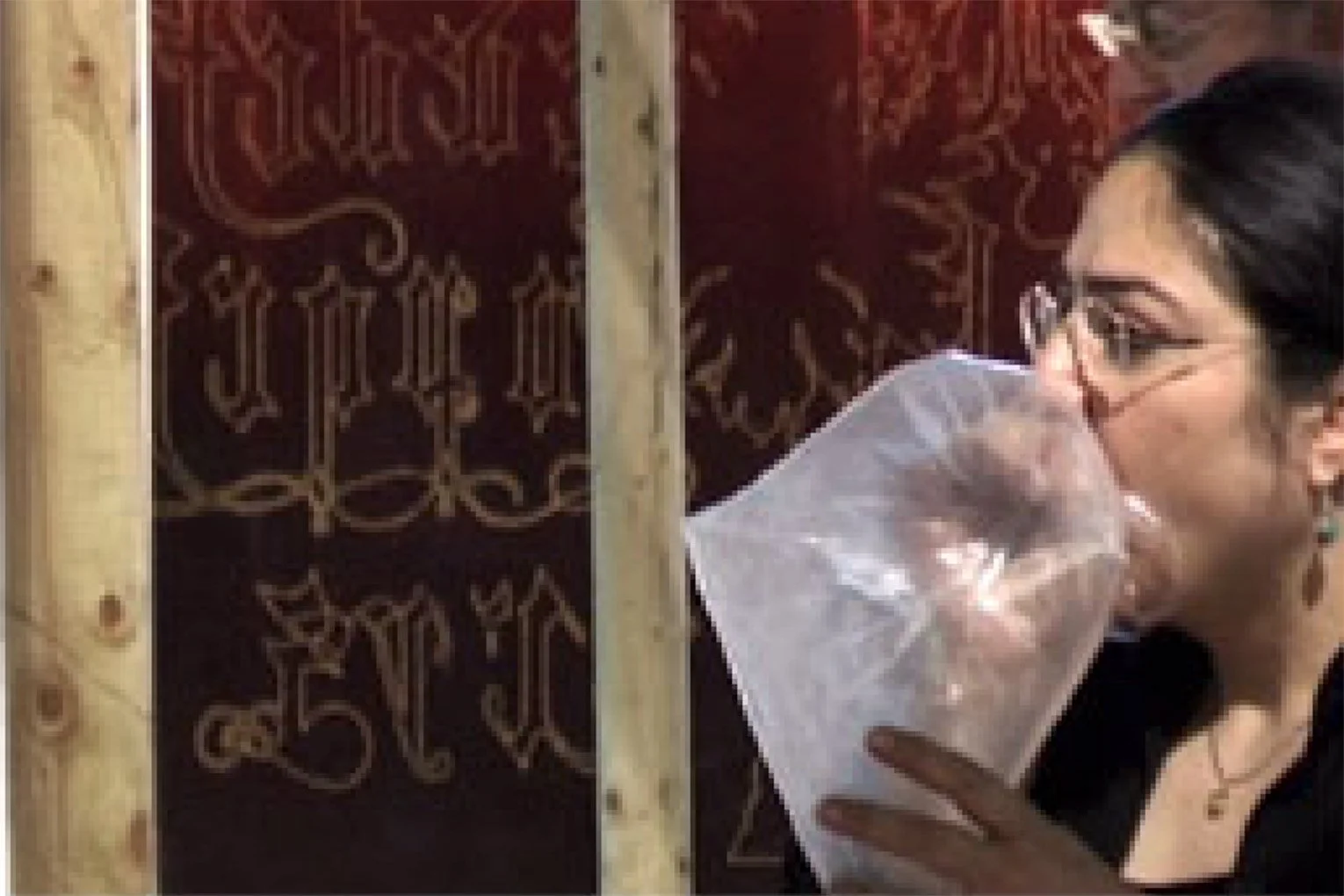 Beduin tent structure, breath collected in plastic bags, cloth, wooden poles